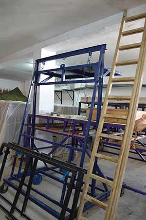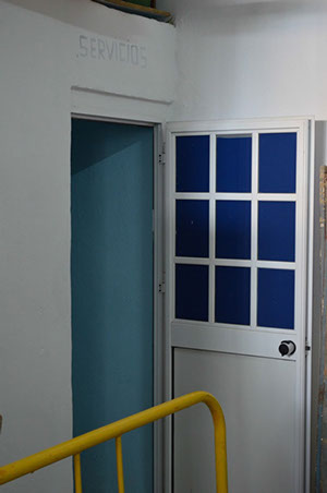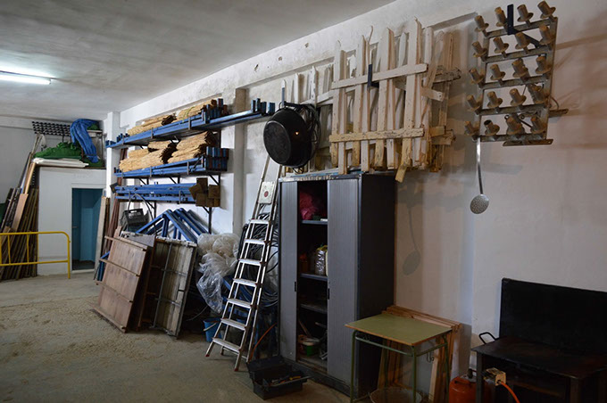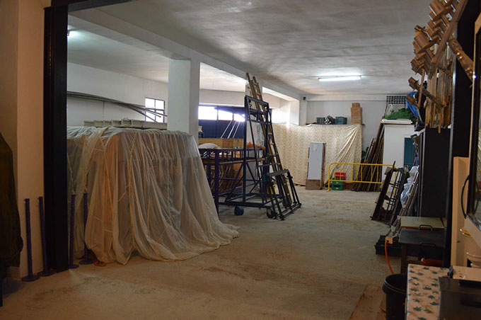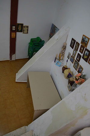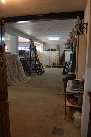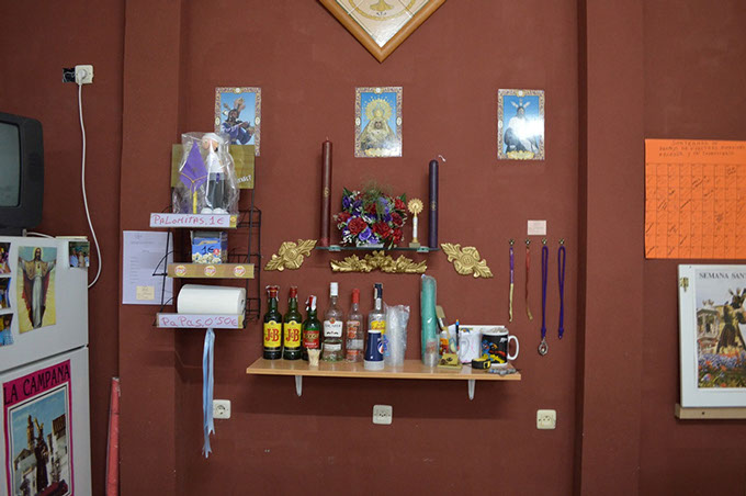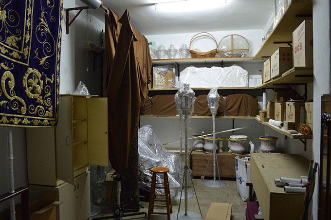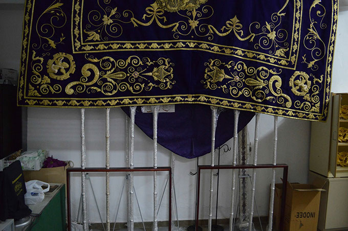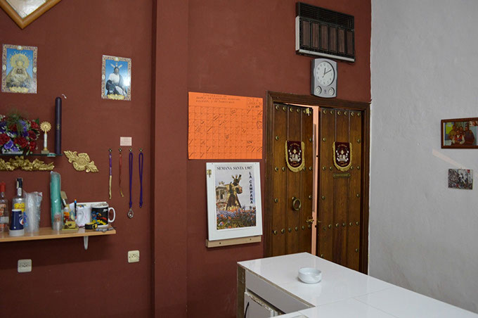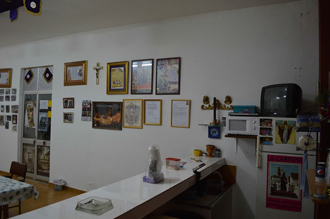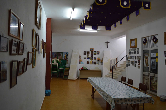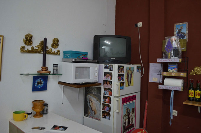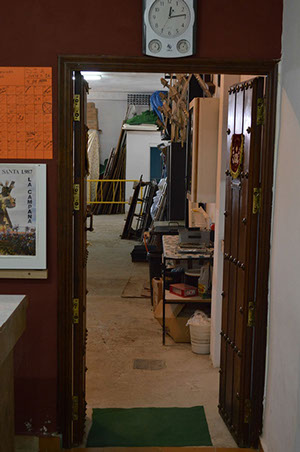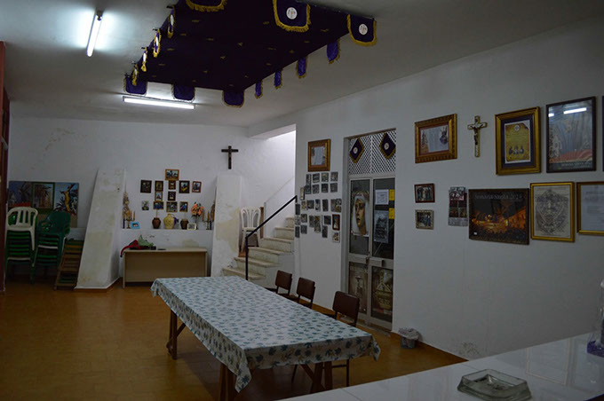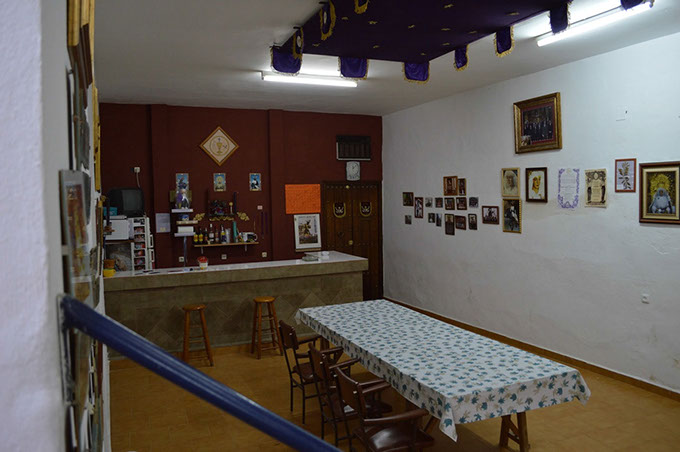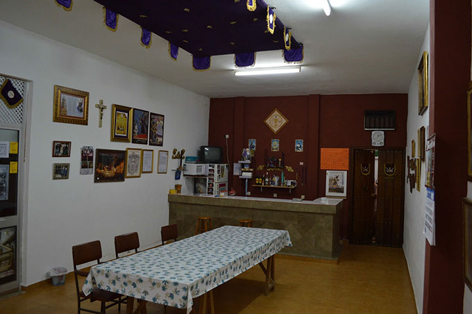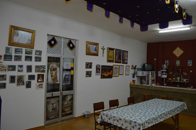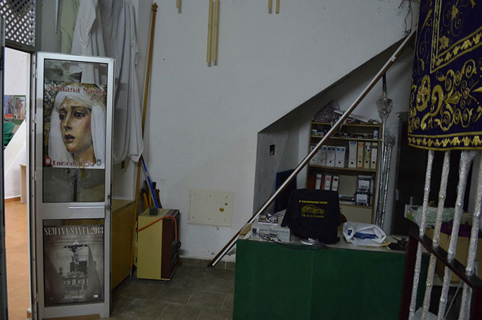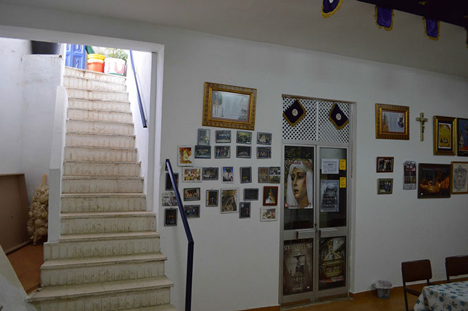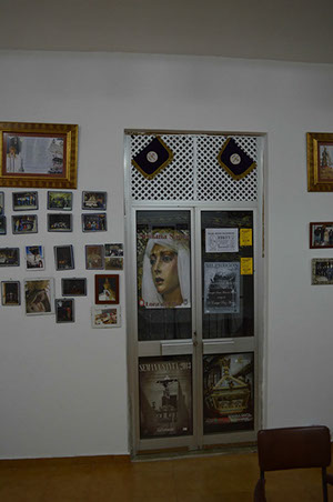 La Casa de Hermandad posee dos accesos, uno principal por la Calle Katanga, y uno secundario por la Carretera Palma del Río. Ésta se organiza de la siguiente manera: nada más acceder por la C\Katanga encuentras una escalera para descender a ésta; desde la escaleras obtienes acceso a un salón de reuniones/bar; desde aquí se obtiene acceso a dos estancias independientes entre sí, primero a una zona de almacenaje de enseres (desde Mantos de la Virgen, pasando por candelería y demás enseres) y segundo, a otra zona de almacenaje de grandes dimensiones como son los pasos procesionales, pasos de ensayos, y otro objetos grandes como partes de la caseta de feria etc. Ésta última estancia posee una puerta de cochera, la cual es el acceso desde la carretera de Palma del Río.